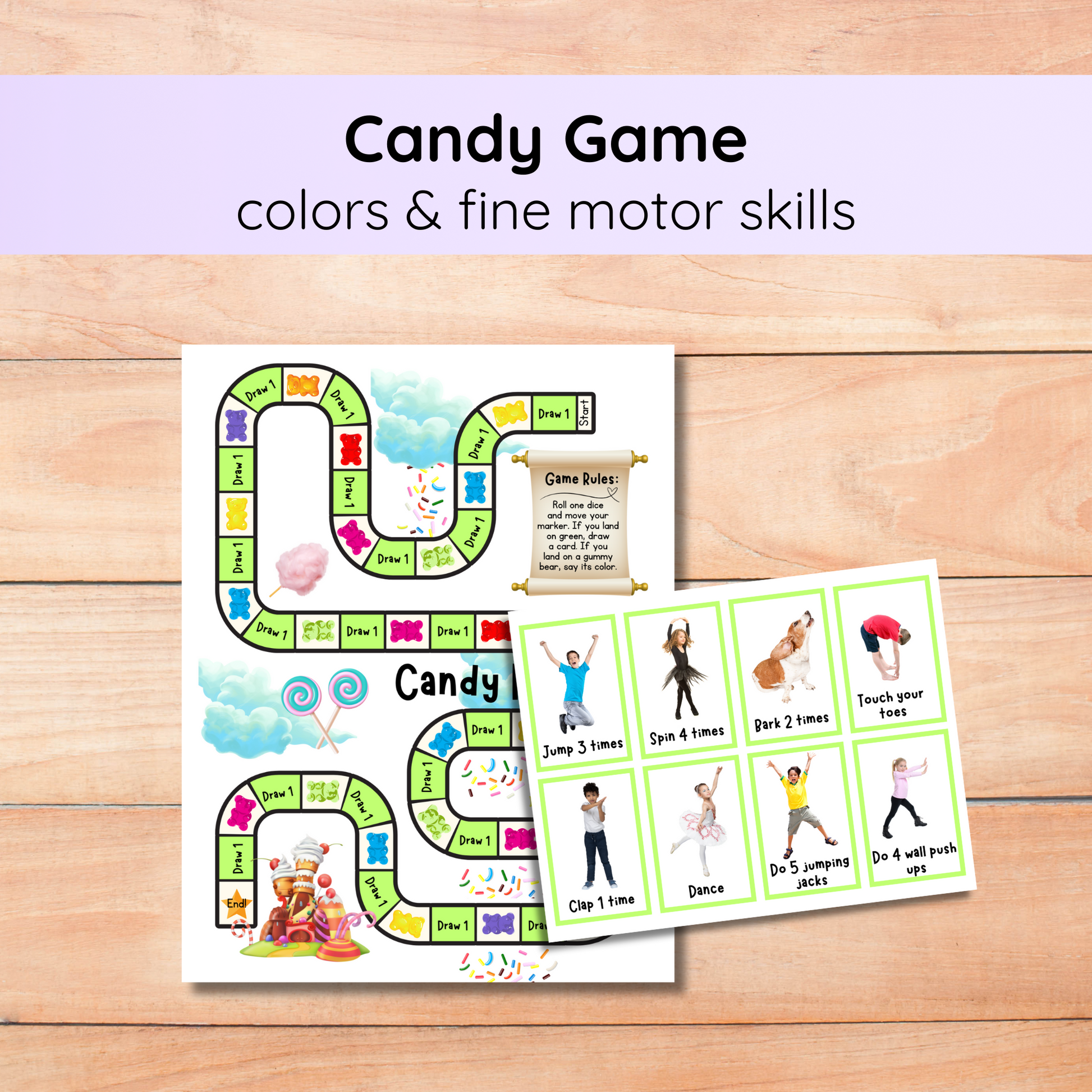 Learn colors and get moving with this fun printable board game. Choose a small toy or manipulative to mark your place. (Dice needed.) 4 pages-one board game and 3 card pages to cut out. This game is great for learning colors and using fine motor skills to copy what it says to do on the cards.