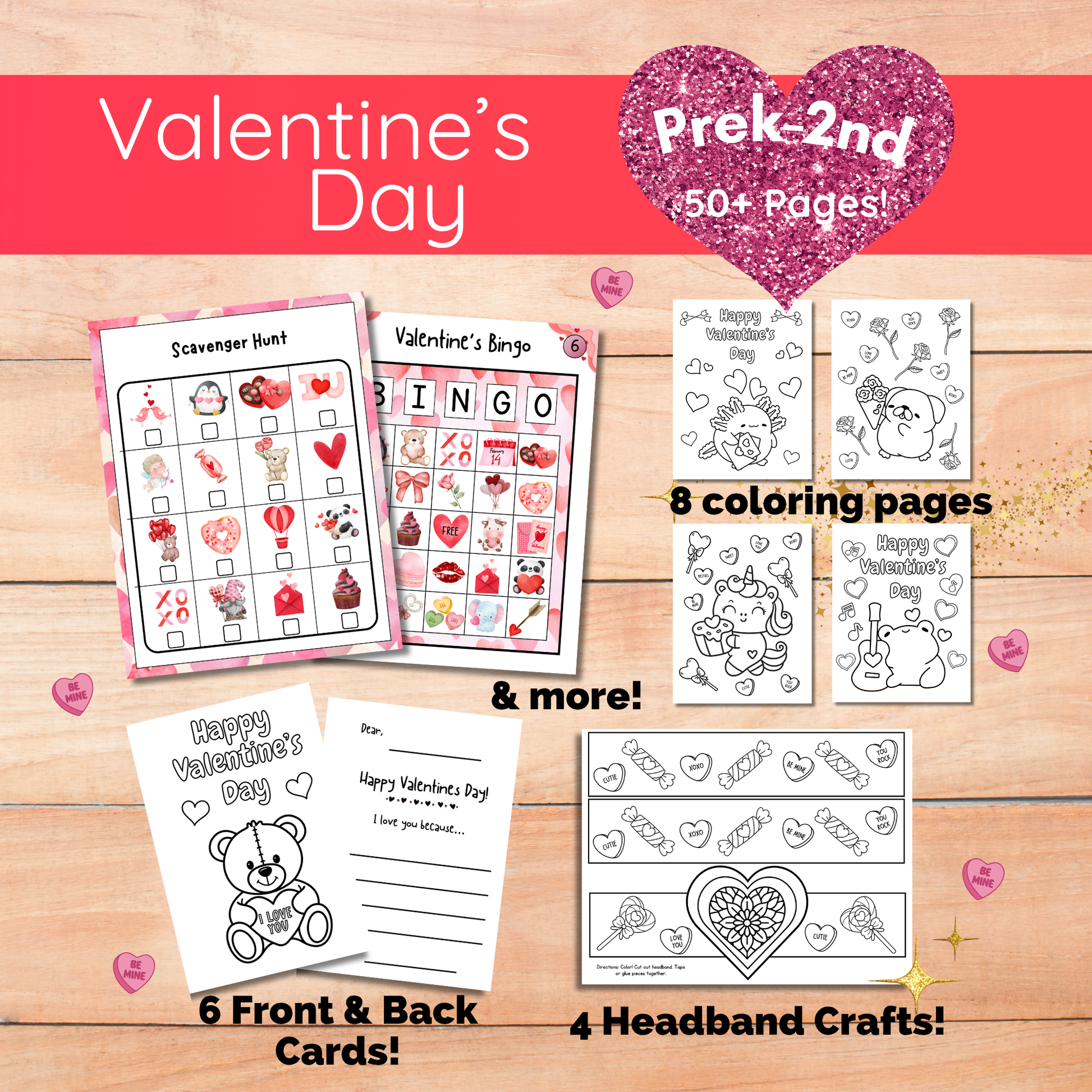 This set comes with coloring pages, mazes, Valentine's Day crowns, cards, Bingo, a scavenger hunt, & more! Prek-2nd. There are 56 pages total. The Bingo has 8 Bingo sheets.